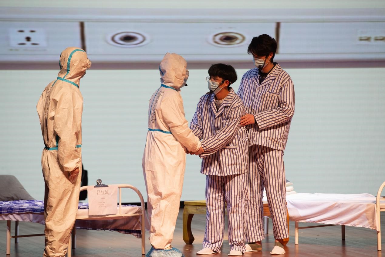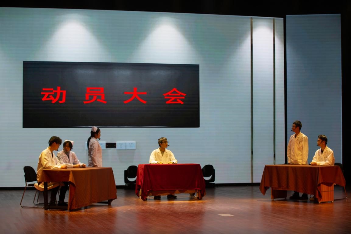 大型原创抗疫话剧《白衣如甲》成功展演。全校300余名师生和社会各界人士共同观看了此话剧。