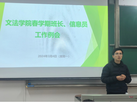 春学期班长、信息员工作例会在博学楼405教室顺利召开。本次例会由学工办辅导员计丹峰主持,辅导员闫诗佳、吴广以及7ai