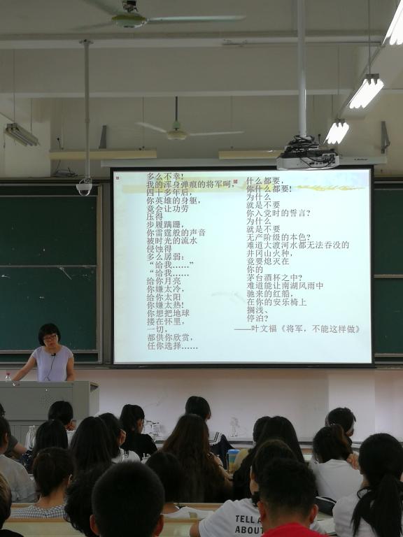 马琳当选为学生“心目中好老师”,她的课生动活泼,既知识含量高,又满满正能量,深受学生欢迎。课堂上马琳老师先后介绍了上世纪80年代主要诗歌潮流:归来的诗、干预生活的诗、朦胧诗等。以艾青《归来的歌》、流沙河《归来》为代表的归来诗歌咏“归来”,把生活道路的挫折磨难所获得的体验折射在诗作中,以批判-反思的眼光看待被文革破坏了的社会秩序和人生规范,警示人们在和平年代勿忘历史,以史为鉴。《将军,不能这么做》是一首维护革命神圣性的诗,体现出诗人叶文福崇高的爱国主义精神,对新时期反腐倡廉建设具有重要意义。朦胧诗群是中国社会发展的一个特殊时代的产物,凝聚着对于当代社会灾难的严峻反思和批判精神。第三代诗人群以“解构”为核心,反对话语霸权和专制,呈现出与北岛、舒婷为代表的朦胧诗人不同的创作风格和精神面貌。