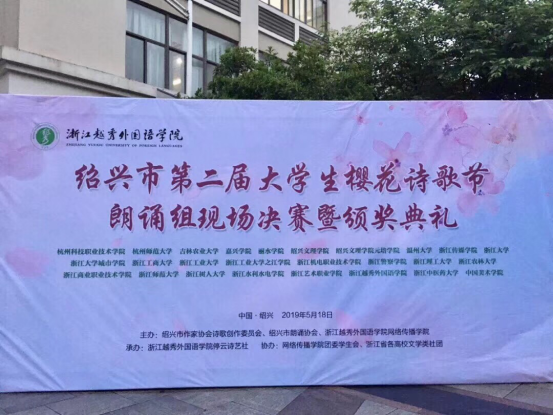 5月18日下午,绍兴市第二届大学生樱花诗歌节朗诵现场组决赛暨颁奖典礼在绍兴浙江越秀外国语学院镜湖校区举行。我校7ai