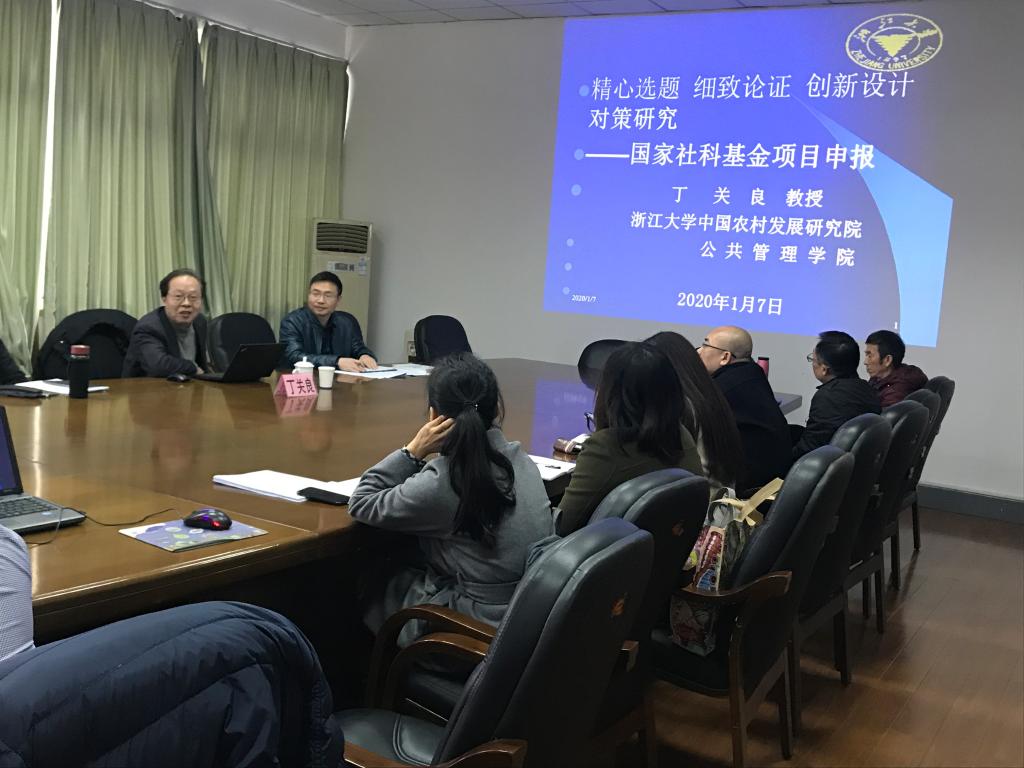 2020年01月07日下午,浙江大学丁关良教授应邀到7ai 做了一次题为“精心选题 细致论证 创新设计 对策研究——国家社科基金项目申报”的辅导交流会。国家社科基金申报辅导会在梁林校区一号楼426会议室举行。丁教授主要针对国家社科基金项目申报时需仔细阅读《课题指南》、写好项目申请书、细致论证创新点等方面进行了深入阐述。本次国家社科基金申报辅导会最终在大家热烈的掌声中落幕。