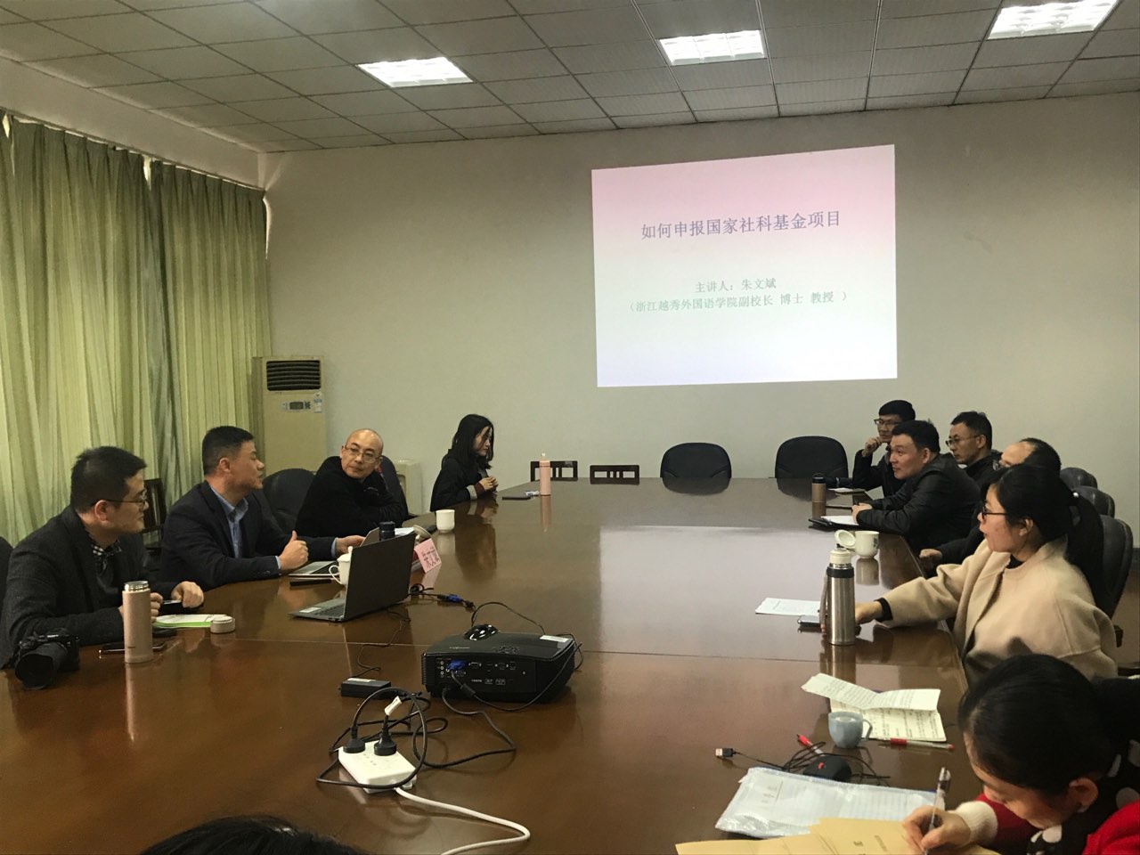 2020年11月26日下午,浙江越秀外国语学院副校长朱文斌应邀到7ai 作题为“如何申报国家社科基金项目”的交流辅导会。此次辅导会在梁林校区一号楼426会议室举行。朱校长主要从课题申报的概况、相关的注意事项、如何填报申请书以及自己的心得体会等方面阐述了如何才能在国家社科基金项目的申报过程中取得成功。参会教师纷纷表示,本次国家社科基金申报辅导会让老师们受益匪浅。