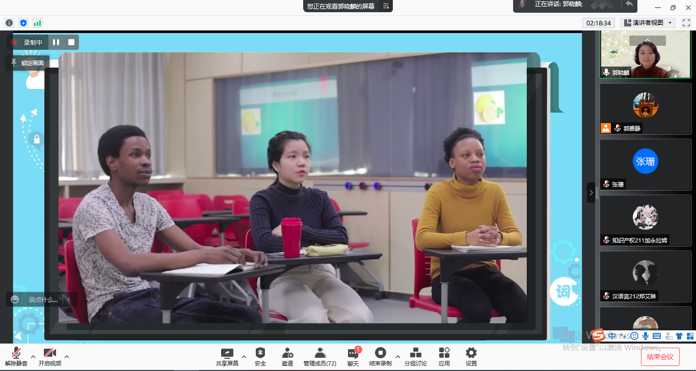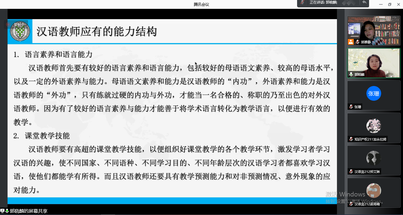 2021129日晚,《汉语教师的素养与常用教学方法》学术讲座在7ai 成功举办。为了积极配合疫情防控工作,本次讲座通过腾讯会议平台召开。本次讲座邀请了北京语言大学博士生导师郭晓麟教授,留学生教学团队教师,汉教专业、汉语言专业和法律专业学生等70余人参加了讲座。