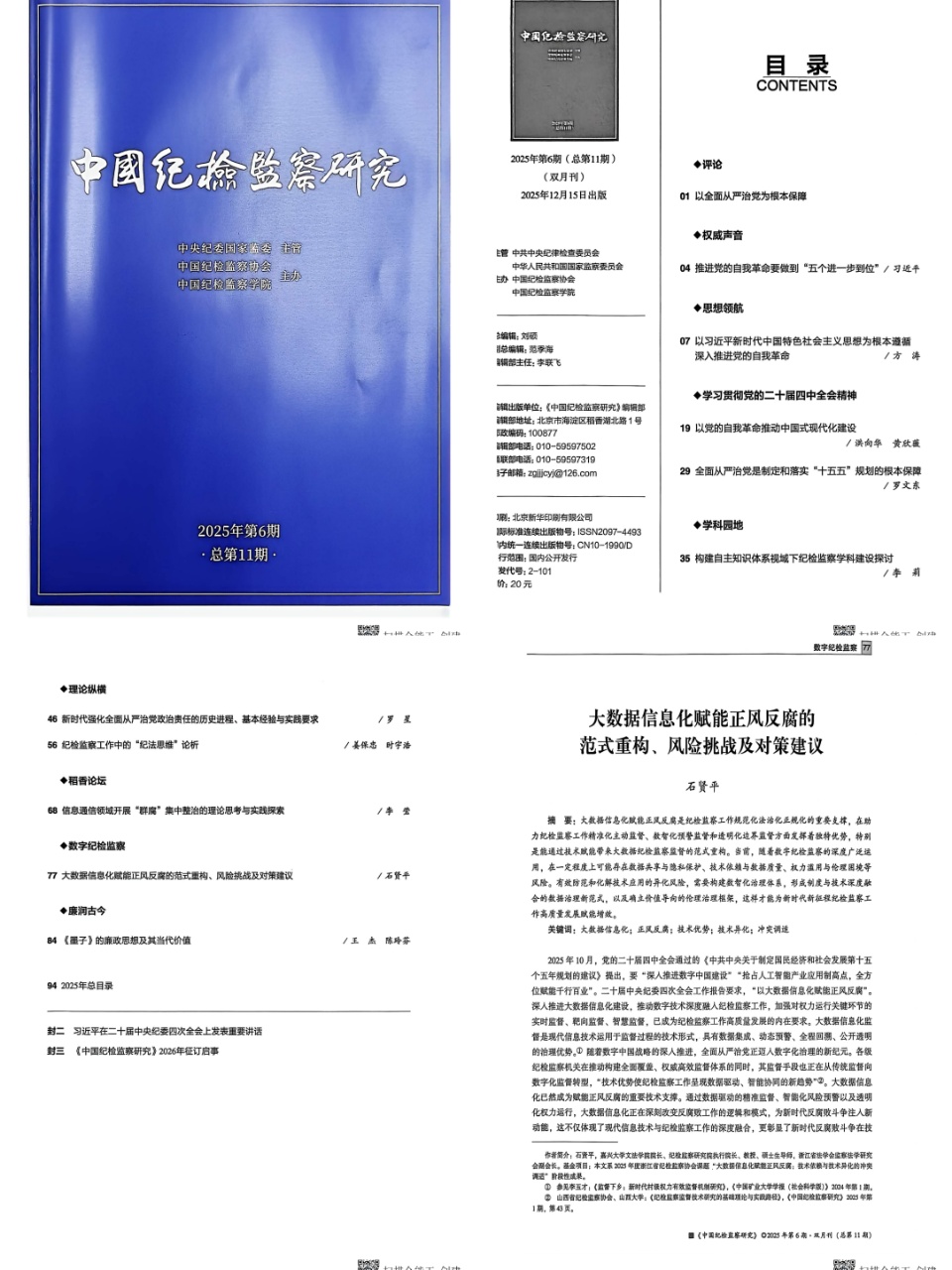 院长兼纪检监察研究院执行院长石贤平教授在《中国纪检监察研究》(2025年第6期)发表题为《大数据信息化赋能正风反腐的范式重构、风险挑战及对策建议》的学术论文,为深化纪检监察体制改革、推动监督工作数字化转型提供了理论参考与实践指引。