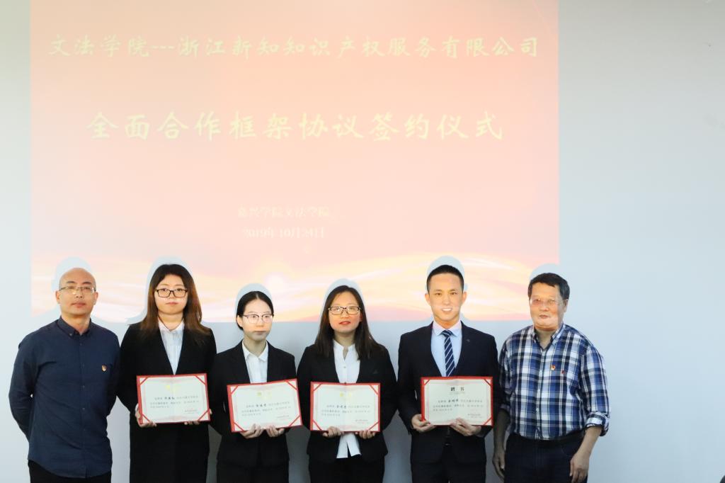 仪式上,双方签署了全面合作框架协议,并为浙江新知知识产权服务有限公司进行“嘉兴学院校外实践实训基地”授牌。随后双方互相颁发了兼职人员聘任证书。