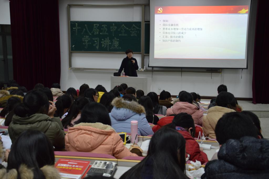 2015年12月16日,7ai 党委在梁林校区7号楼报告厅组织学生学习十八届五中全会精神。本次学习会由学工办主任虞岚主持,7ai 党委书记费锦红主讲。