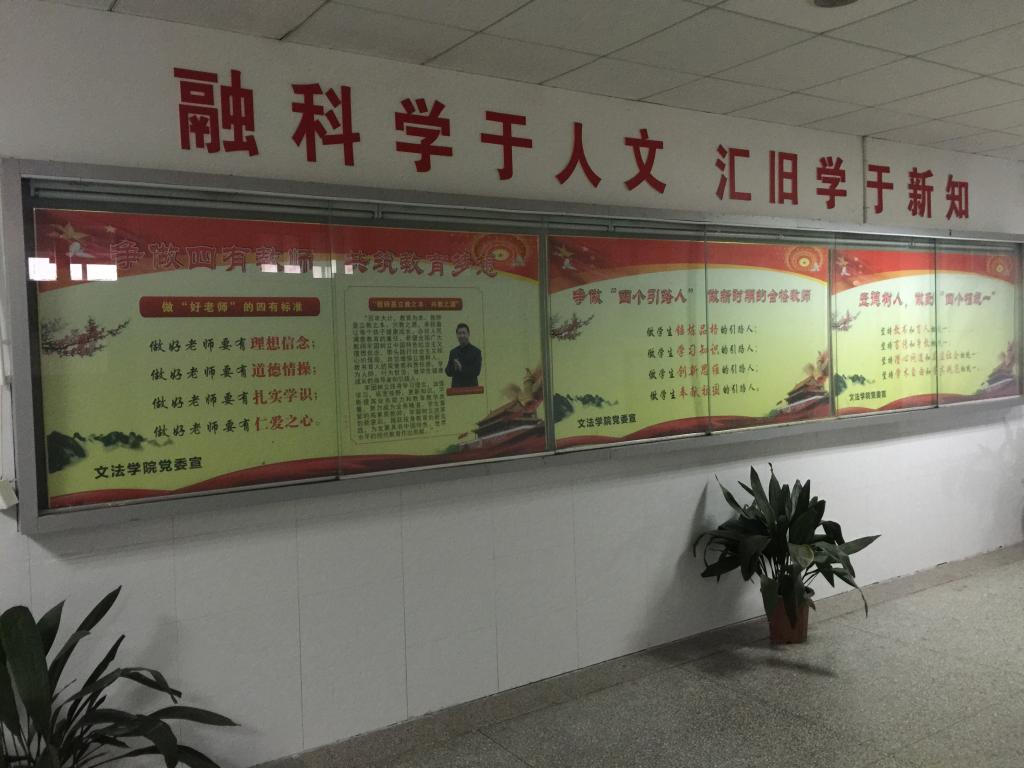 利用走廊文化建设,将新时期好教师“三个四”的标语做成展板在学院走廊展示,将学习形式变得更加灵活生动。