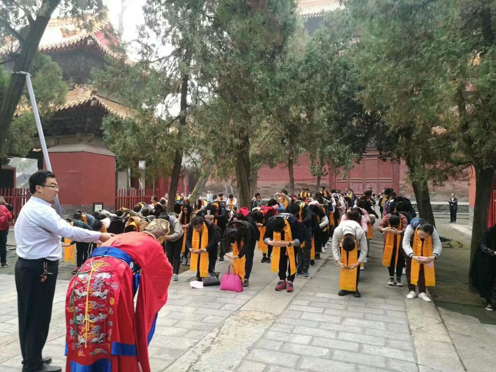 14日早上,文法学子怀着崇敬之情来到了万仞宫墙前,参加开城仪式。八点,开城仪式准时开始,奏乐、开道、迎宾……开城官宣布开城,整个仪式并不复杂但庄严而隆重。进入城内,在导游的引导解说过程中,众学子经由孔庙中路,依次穿过金声玉振坊、棂星门、太和元气坊直至大成殿并汇集于此。在孔庙司仪主持下,学子们在大成殿前向孔子行拜师礼(作揖礼)、宣读拜师告文、诵读经典。