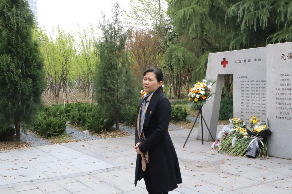 学院党委书记洪坚率领各支部书记、委员及学生党员代表来到梁林校区“无语良师”碑前追思悼念。悼念仪式由学院党委委员、学工办主任兼团委书记虞岚主持。洪坚代表学院党委向“无语良师”敬献鲜花,全体党员鞠躬致礼,表达对“无语良师”无私大爱的生命礼赞。随后,洪坚结合“无语良师”的背景由来、重要意义及当下启示给党员们讲授了一场“现场党课”,全体党员深受感动备受鼓舞。
