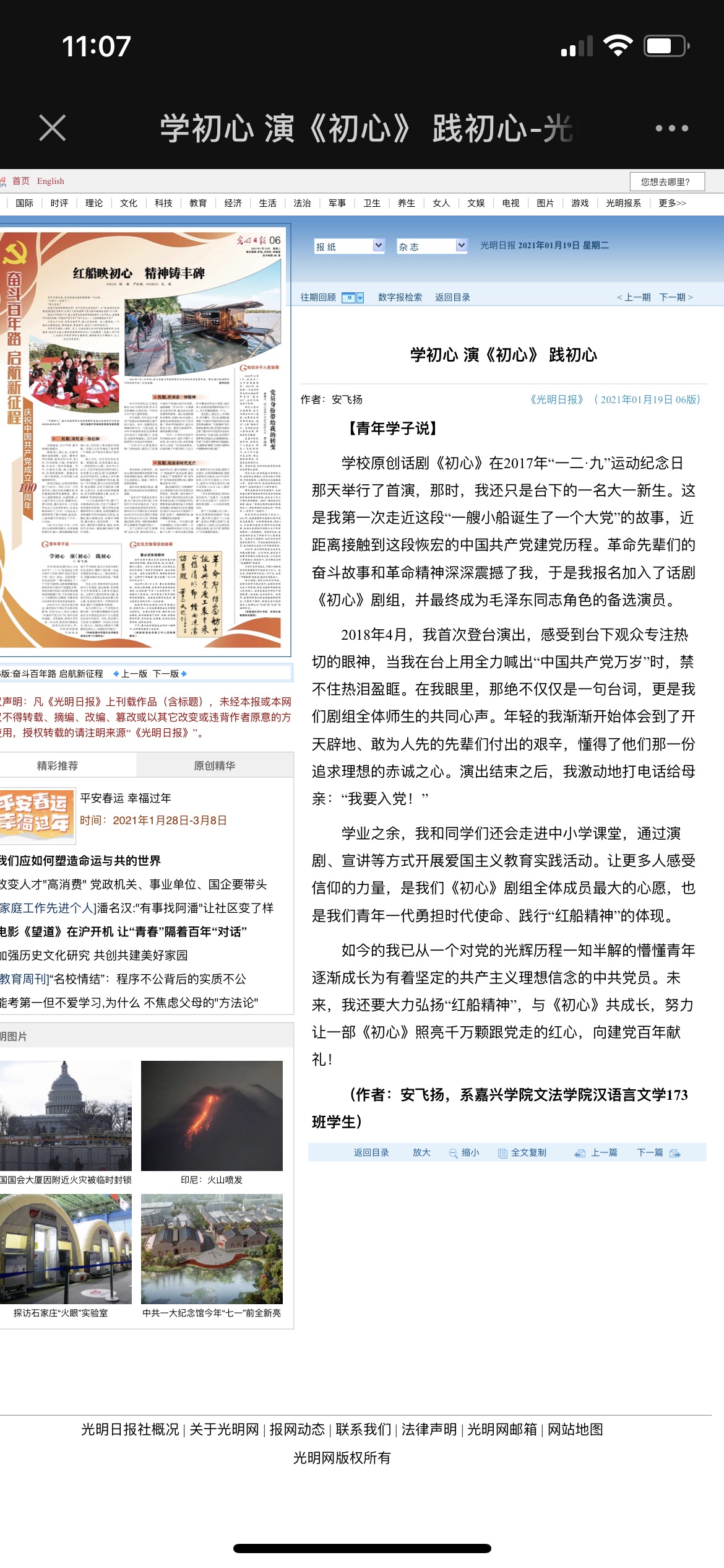 2021年1月19日,7ai 汉语言文学173班安飞扬同学在《光明日报》上发表名为《学初心 <演初心> 践初心》的文章。文章描述了安飞扬同学在饰演原创红色话剧《初心》中毛泽东同志时被红船精神所震撼,从一个对党的光辉历程一知半解的懵懂青年成长为有着坚定的共产主义理想信念的中共党员的历程,展现了新时代青年勇担使命的优秀形象。
