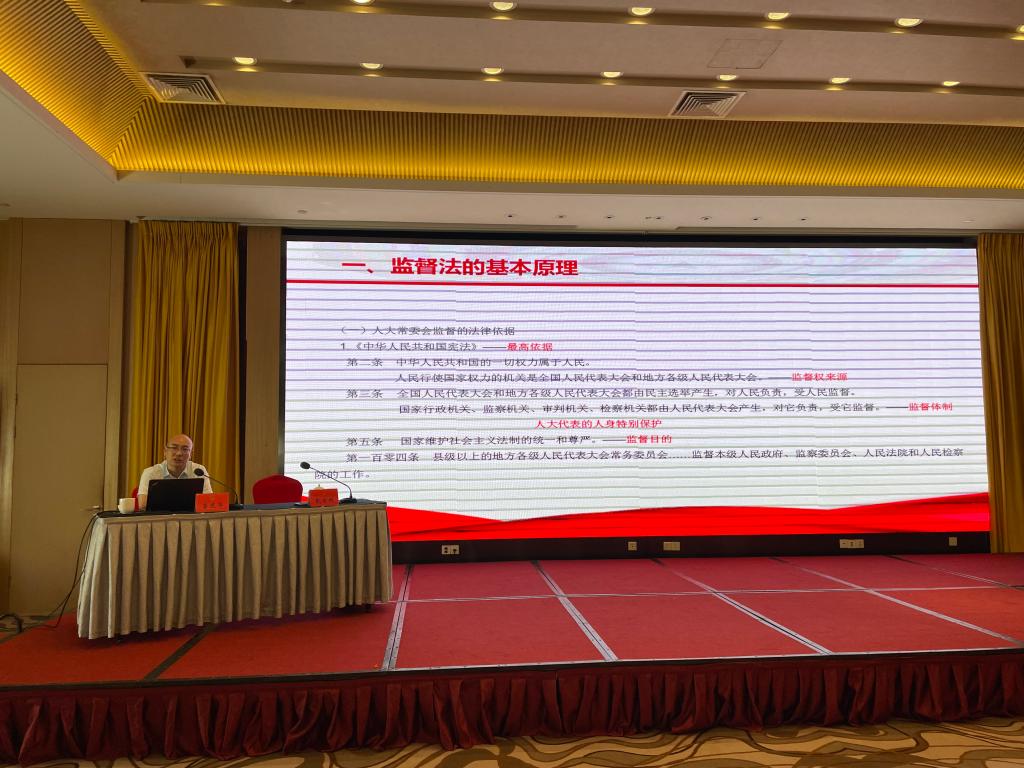 副院长(主持工作)童建华受南湖区人大常委会邀请,在南湖区人大代表履职培训会上做《中华人民共和国各级人民代表大会常务委员会监督法》讲座。童建华副院长从监督法的基本原理、监督法的主要内容两个方面对监督法进行了系统解读,并结合规范性文件备案审查的实践对人大常委会如何开展监督进行了说明,讲座理论结合实践,深入浅出,取得了很好的反响。南湖区人大常委会主要领导、各镇(街道)人大领导以及200多名南湖区九届人大代表参加学习。