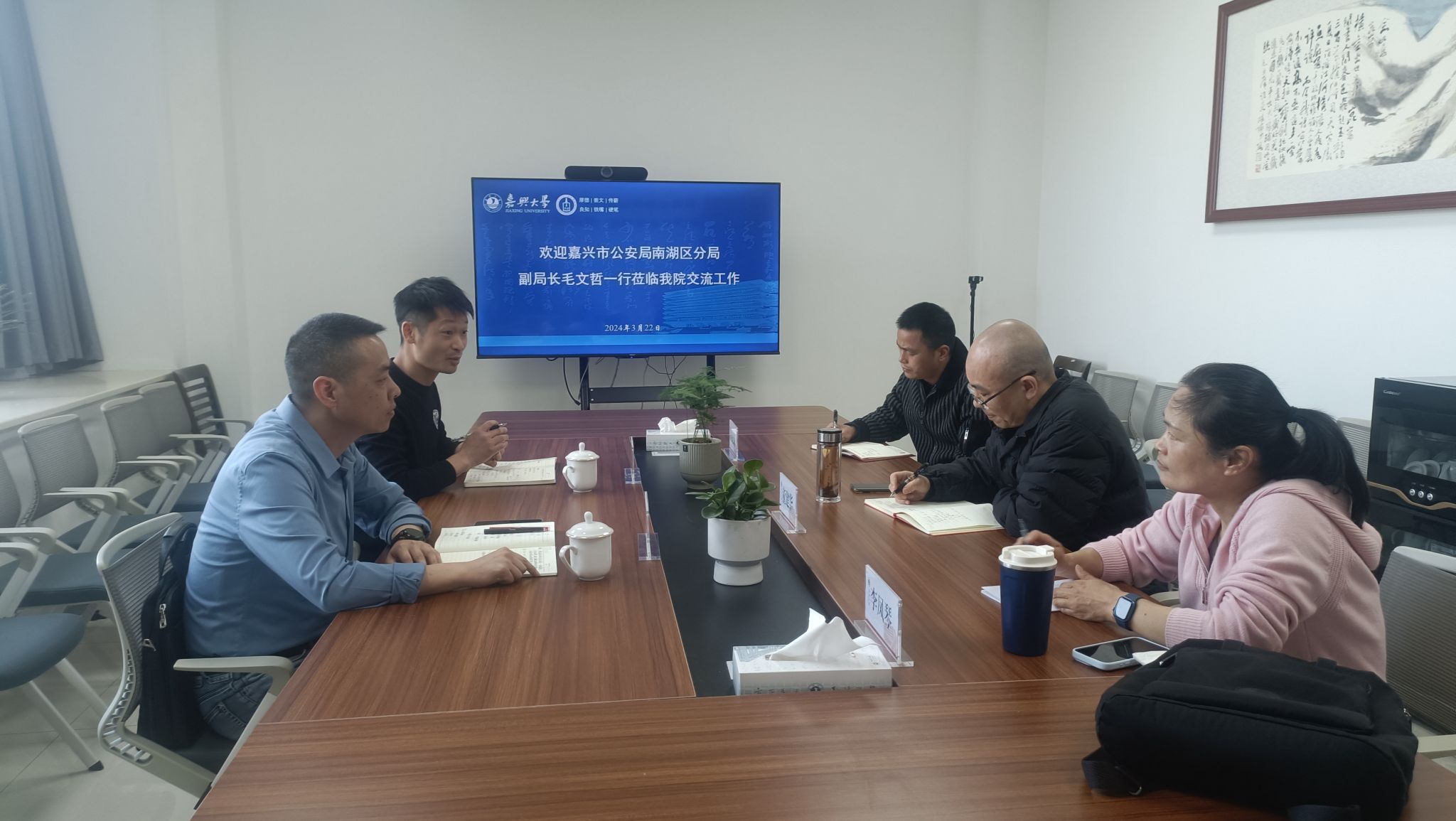 3月22日下午,嘉兴市公安局南湖区分局副局长毛文哲一行2人来7ai 交流工作。7ai 党委书记童建华主持会议。法学系李凤琴副教授、周述荣博士参加座谈交流。