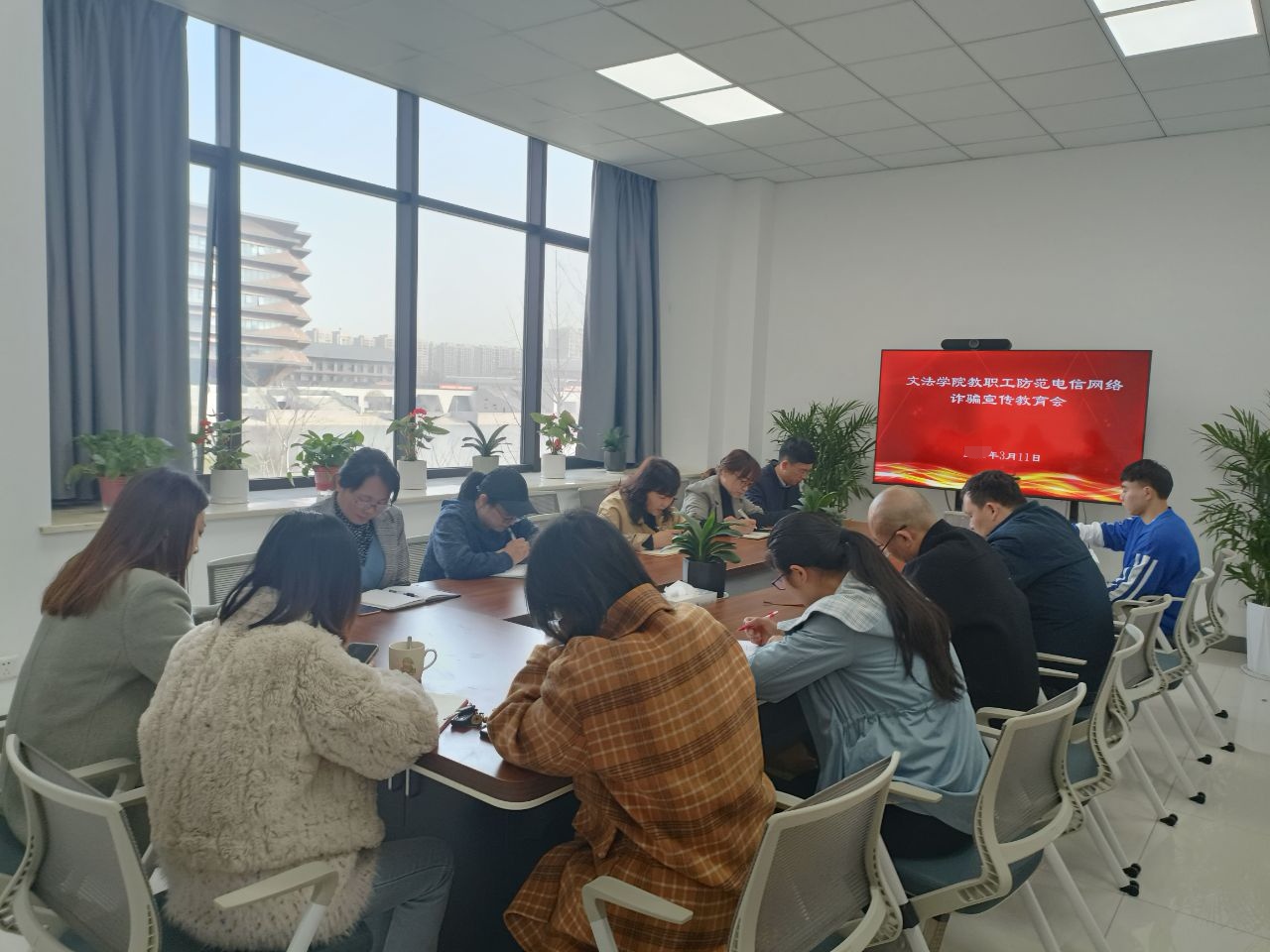 3月11日上午,7ai 在厚德楼268会议室召开“防范电信网络诈骗宣传教育”专题会,学院党政领导及行政人员参加会议。学院党委书记洪坚,传达了学校防范校园电信网络诈骗工作专题会议精神,通报了近期发生的电信网络诈骗案件,强调防范电信网络诈骗宣传教育是校园安全工作的重要内容,希望师生要引起高度重视,认真学习相关精神,做好防诈100题,守护师生的“钱袋子”。法学系和中文系教师分别召开专题会议进行宣传学习。