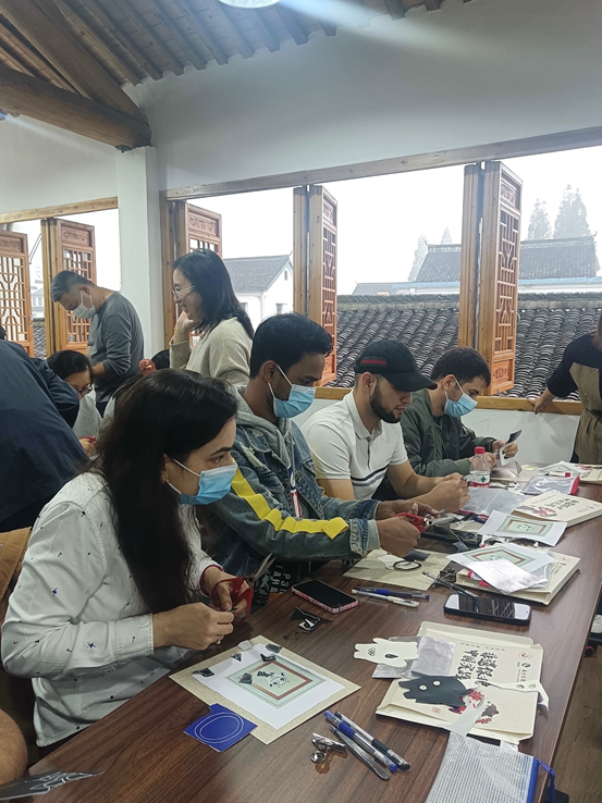 与留学生国情教育工作室联合南湖晚报,组织来自巴西、塔吉克斯坦、孟加拉、巴西等4国留学生走进嘉兴美丽乡村,体验嘉兴非遗文化——皮贴画。