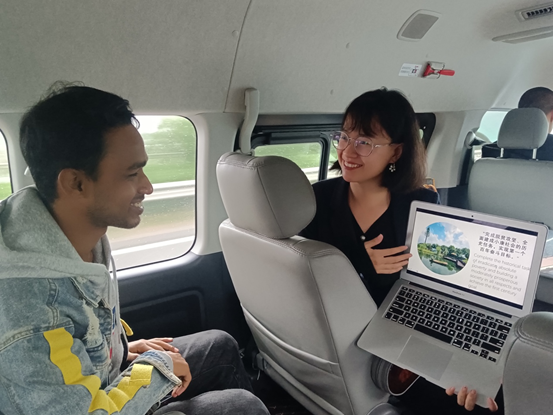 在路上,留学生国情工作室教师王越结合美丽乡村、共同富裕生动地向留学生宣讲了中共二十大精神。
