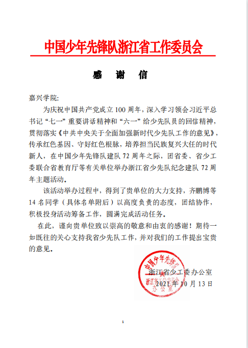 会后,共青团浙江省委给学校发来了感谢信,对团队成员精彩表现给予充分肯定。